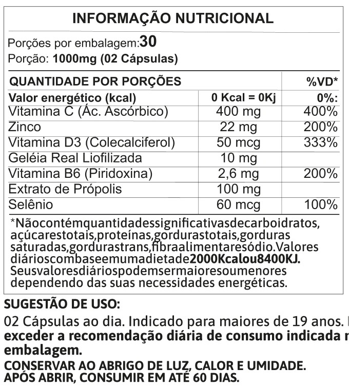 Vitamina C (Ác. Ascórbico) 400 mg, Zinco 22 mg, Vitamina D3 (Colecalciferol) 50 mcg, Geléia Real Liofilizada 10 mg, Vitamina B6 (Piridoxina) 2,6 mg, Extrato de Própolis 100 mg, Selênio 60 mcg.