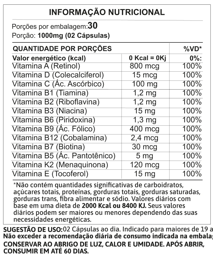 Vitamina A (Retinol) 800 mcg, Vitamina D (Colecalciferol) 15 mcg, Vitamina C (Ác. Ascórbico) 100 mg, Vitamina B1 (Tiamina) 1,2 mg, Vitamina B2 (Riboflavina) 1,2 mg, Vitamina B3 (Niacina) 15 mg, Vitamina B6 (Piridoxina) 1,3 mg, Vitamina B9 (Ác. Fólico) 400 mcg, Vitamina B12 (Cobalamina) 2,4 mcg, Vitamina B7 (Biotina) 30 mcg, VitaminaB5 (Ác. Pantotênico) 5 mg, Vitamina K2 (Menaquinona) 120 mcg, Vitamina E (Tocoferol) 15 mg.